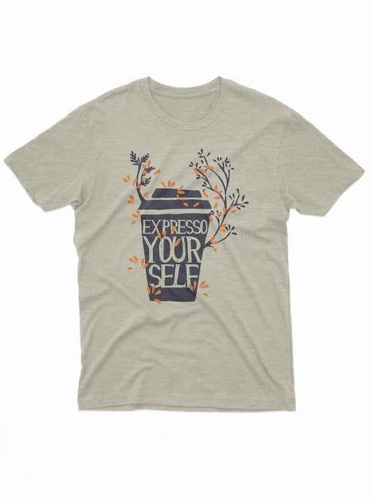 Fuel your mornings with humor in our Espresso Yourself custom t shirt, the perfect graphic tee for coffee lovers who like to wear their passion. Featuring a playful coffee cup design with branches and leaves, this customized tee shirt blends cozy vibes with a witty twist. Crafted with premium t shirt printing and high-quality custom inks, this shirt is lightweight, breathable, and made for all-day comfort. Perfect as a gift for baristas, caffeine addicts, or anyone who loves funny t shirts, this espresso-inspired design fits effortlessly into your collection of vintage t shirts and standout graphic tees.